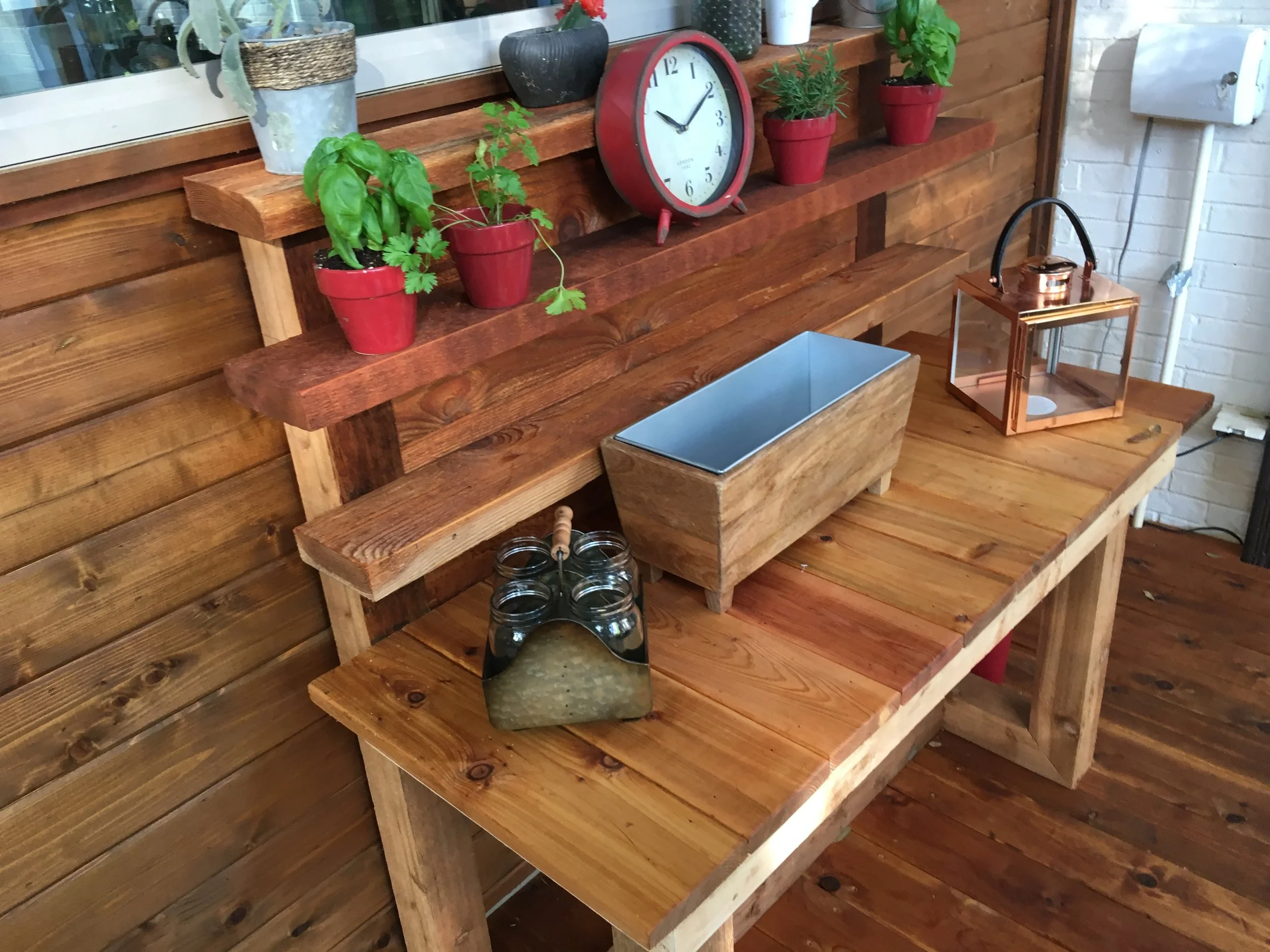 I call this the extra wood hutch. Built on site and hosts the herbs and outdoor dinnerware.